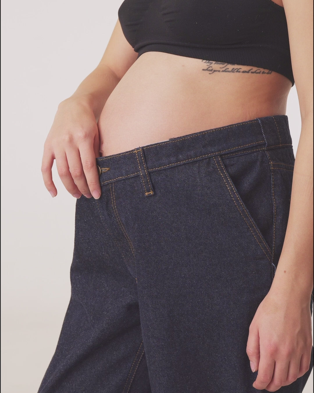Класичні прямі джинси-індиго з інноваційною системою зміни розміру. Унікальна еластична конструкція адаптується до змін фігури без видимих резинок на талії, забезпечуючи природний вигляд та максимальний комфорт. Високоякісний денім із Японії.